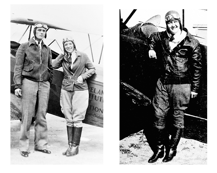 Leora Stroup in 1933 with her flight instructor and Lauretta Schimmoler in 1929, learning to fly in a Waco plane.